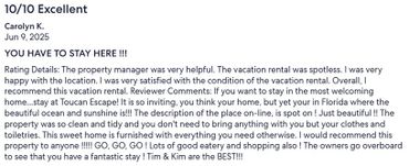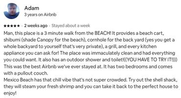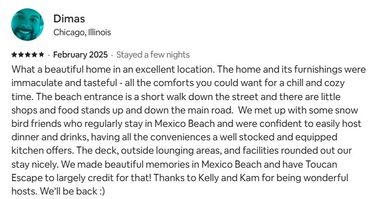 OUR mission is to provide an up-scale, well maintained, clean home with over-the-top furnishings for your comfort, taste and convenience. We hope that you will enjoy our Beach House and Mexico Beach as much as we do and that you take home memories that will last a lifetime with the desire to return to us again. We want to leave the kind of lasting impression that you run home and tell your family & friends all about TOUCAN ESCAPE!!