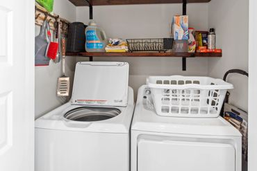 LAUNDRY made easy with a washer & dryer, detergent, dryer balls and an iron/board & steamer.